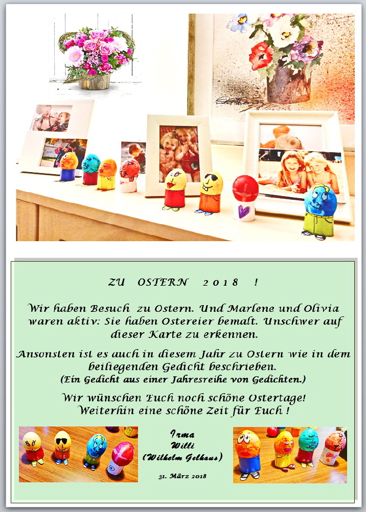 Wir haben uns sehr über die netten Ostergrüße gefreut! Wir sehen an den Bildern, dass der Osterhase in Eurem Hause sehr fleißig ist! Ihr feiert sicher ein recht lebendiges Osterfest! Ist der Osterhase mehr weiblich oder männlich? Wir gehen davon aus, dass Ihr dieses Problem gemeinsam löst!